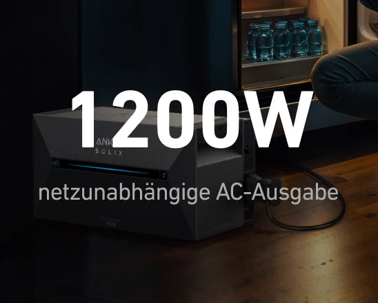 Das Anker Solarbank 2 E1600 AC System bietet eine Ausgangsleistung von bis zu 1200W über die integrierte Schutzkontakt-Steckdose, sodass verschiedene Haushaltsgeräte zuverlässig mit Strom versorgt werden können.